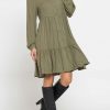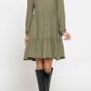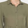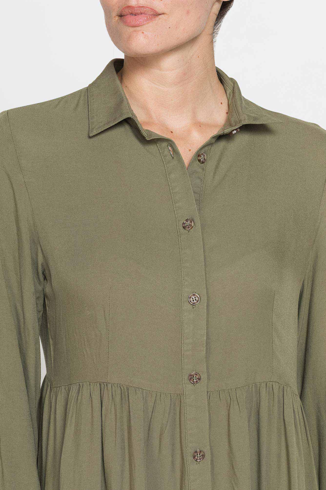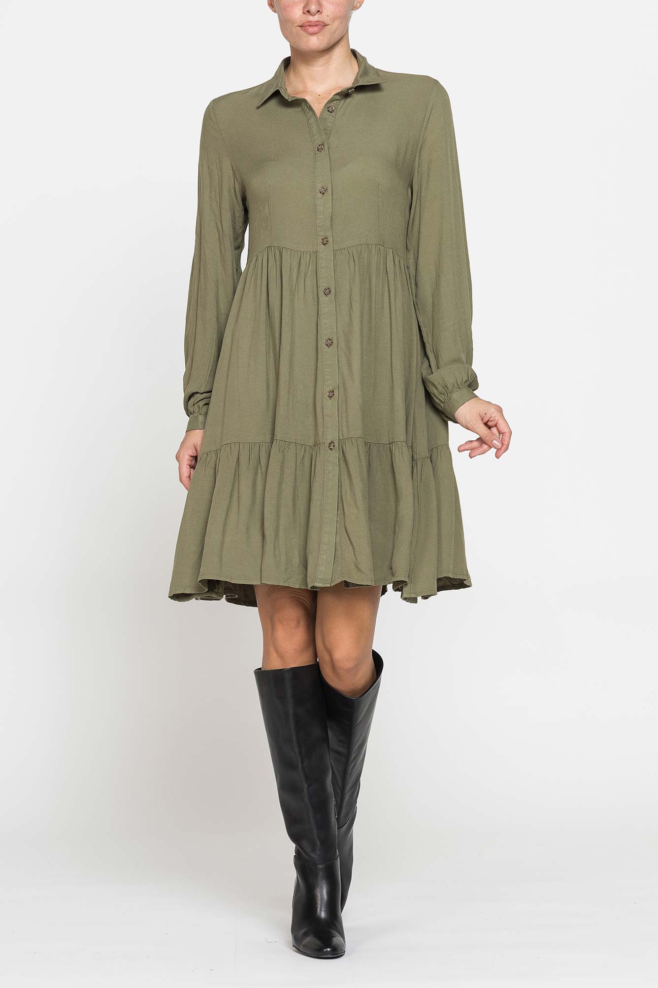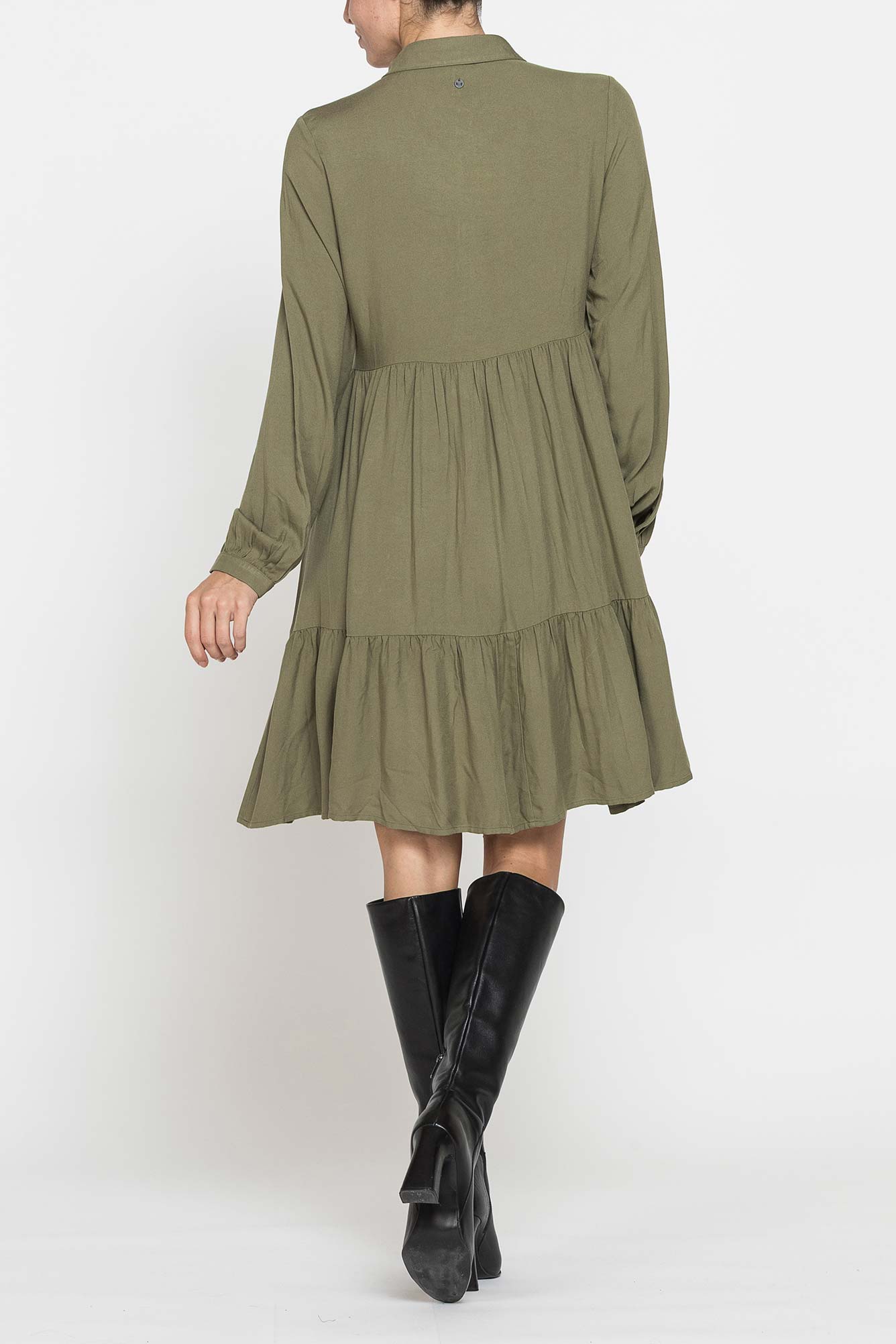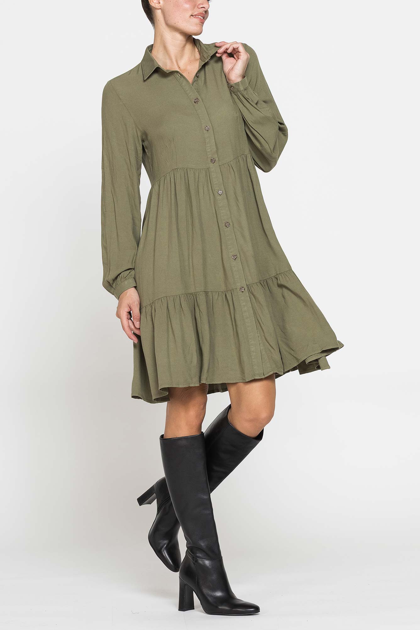 Abito chemisier in morbida viscosa con balze al fondo che donano movimento e femminilit??. Colletto classico e chiusura frontale con bottoni per un look pratico e raffinato, perfetto per ogni occasione. – Composizione: 100% Viscosa