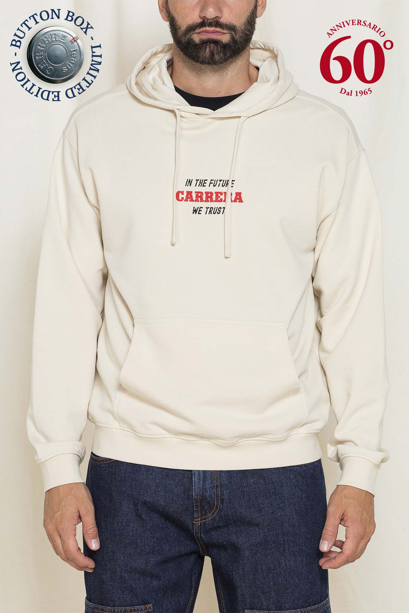 Felpa con cappuccio e tasca centrale, realizzata in puro cotone. Modello dalla vestibilit?? morbida e dall’aspetto vintage, con dettagli a costina su fondo, polsi e collo. La stampa, ispirata all’archivio storico Carrera, celebra i 60 anni di storia del brand. Un capo in edizione limitata che unisce heritage e stile contemporaneo, presentato in una speciale scatola di latta celebrativa da collezione. – Composizione: 100% Cotone