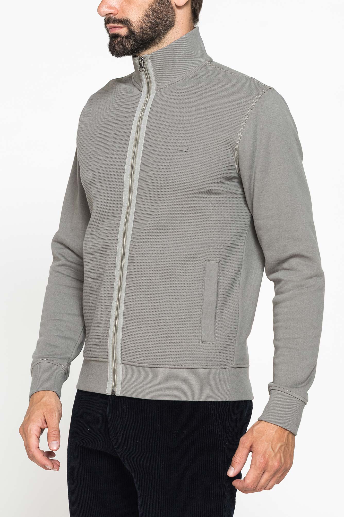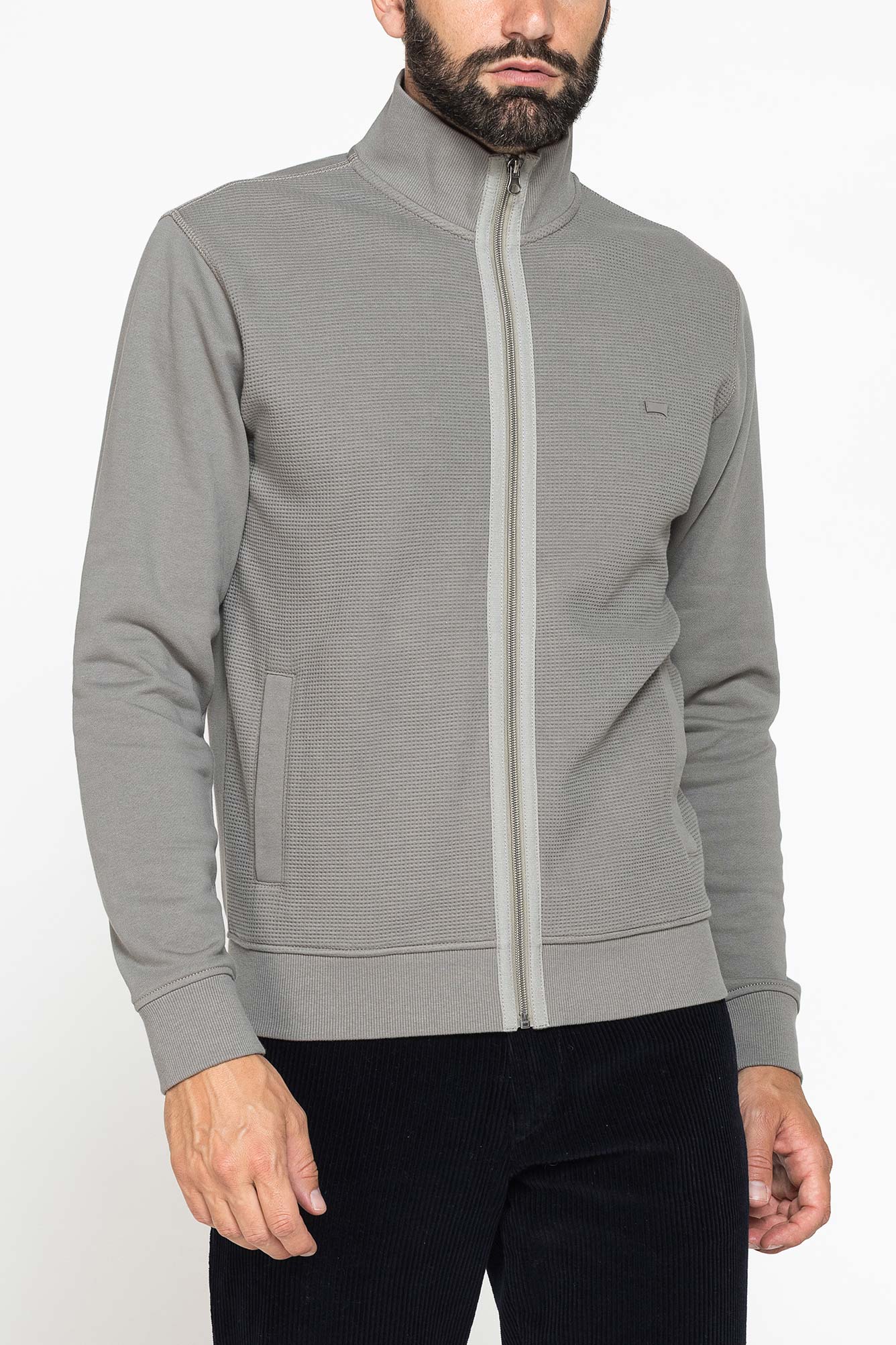 Felpa da uomo con colletto alto e chiusura centrale a cerniera, valorizzata da un tape lungo tutto il percorso. Modello con tasche a filetto, rifiniture in costina su collo, polsi e fondo. Realizzata in tessuto felpa waffle unito ad una lavorazione piatta, per un capo casual e versatile, perfetto per un look rilassato e confortevole. – Composizione: 100% Cotone