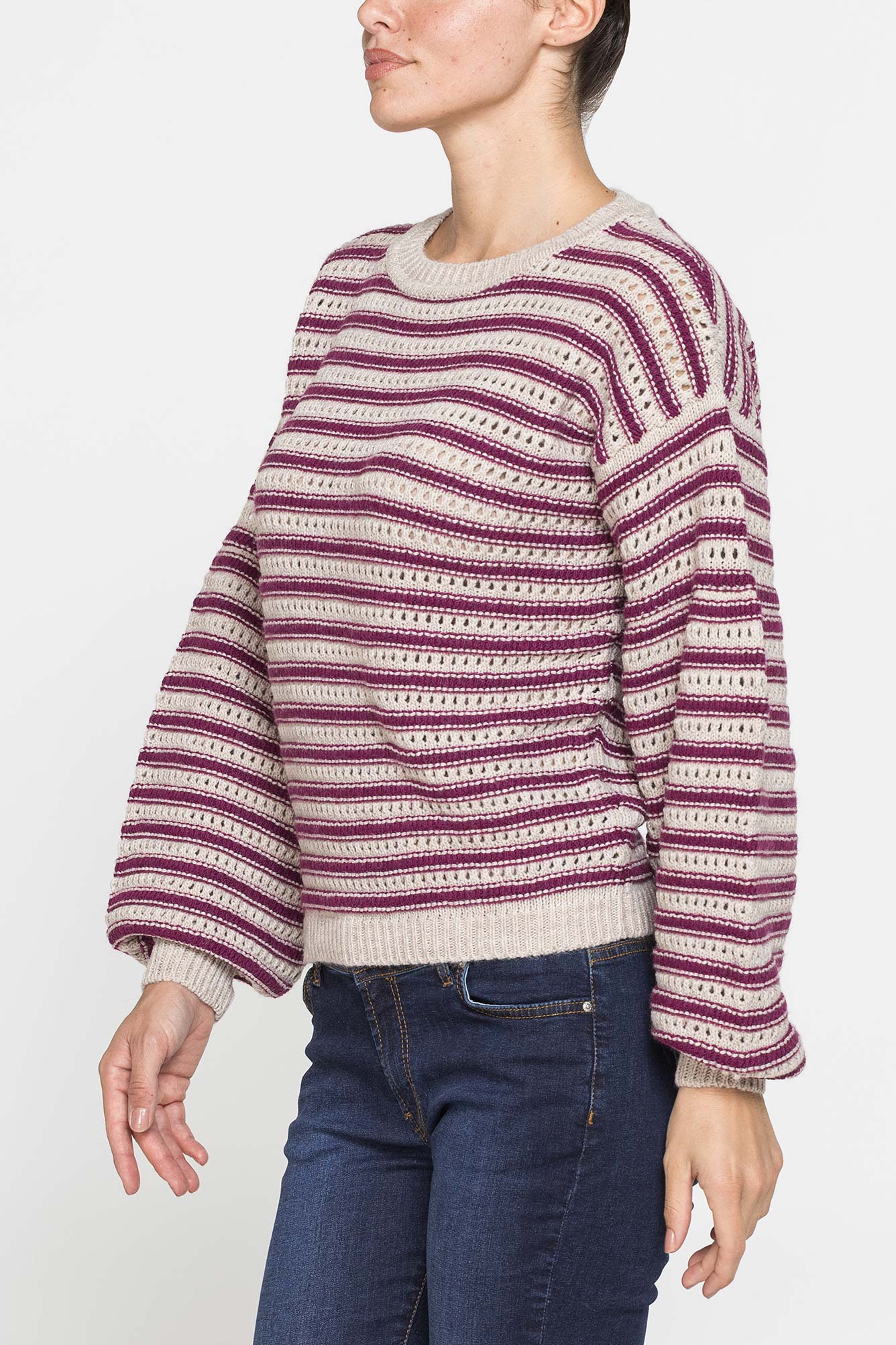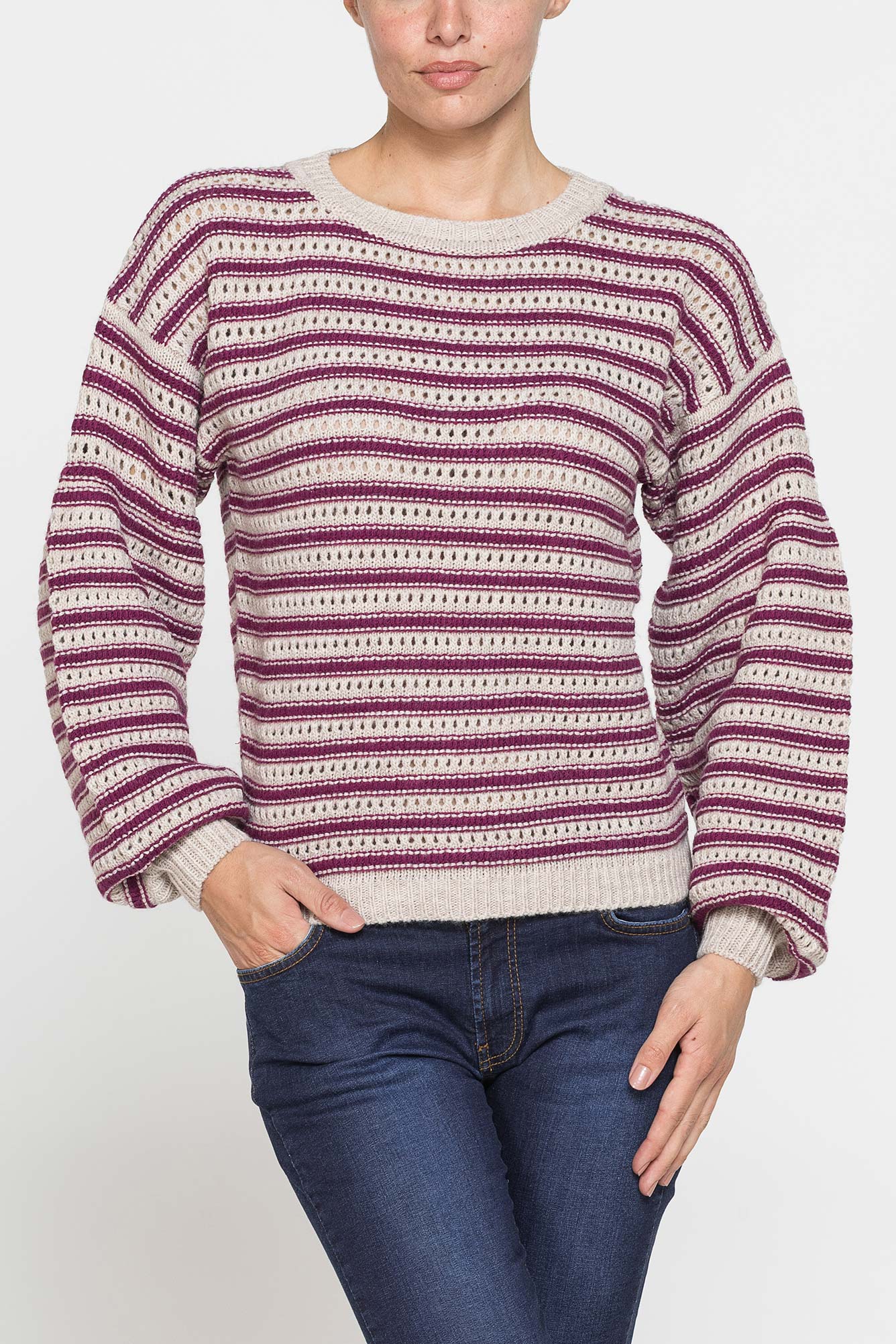 Maglia dalla vestibilit?? regolare , girocollo e caratterizzata da una lavorazione traforata. Le maniche sono leggermente e a prosiutto. Realizzato in filato misto alpaca. – Composizione: 75% Acrilico, 10% Lana, 10% Viscosa, 5% Alpaca